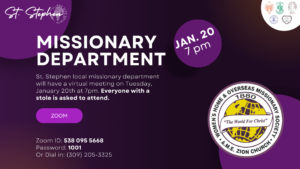 Missionary Department Meeting Event Details Date: January 20, 2026 7:00 pm – 8:30 pm Tags: #Missionary #meeting Zoom ID: 538 095 5668 Password: 1001 Or Dial in: (309) 205-3325